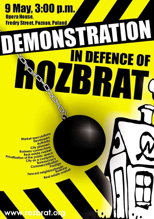 To protest against treating the city as a shopping mall, against conforming everything to the big business, against destroying the social bonds and in defence of places such as Rozbrat - where social, cultural and political functions work together - on 9 May at 3 p.m. in front of the Opera house there will be a demonstration under the slogan "ROZBRAT STAYS - LET'S RECLAIM THE CITY".